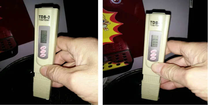 2019年1月3日,在“崂泉联谊交流”微信群中,群友“南通崂泉陈光辉”发了二张照片,是他检测朋友从老家(仙居县横溪镇)带过来的水样,一个是自来水,TDS值是24 mg/L;另一个是地下800米以下的地下水,TDS值是117 mg/L。