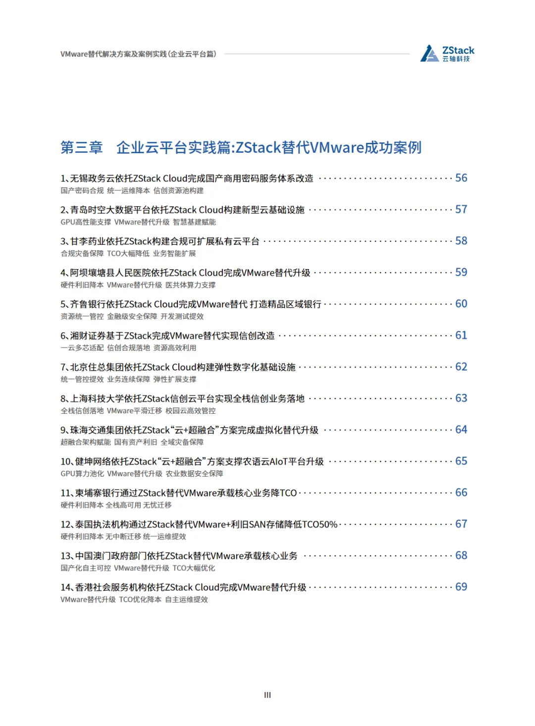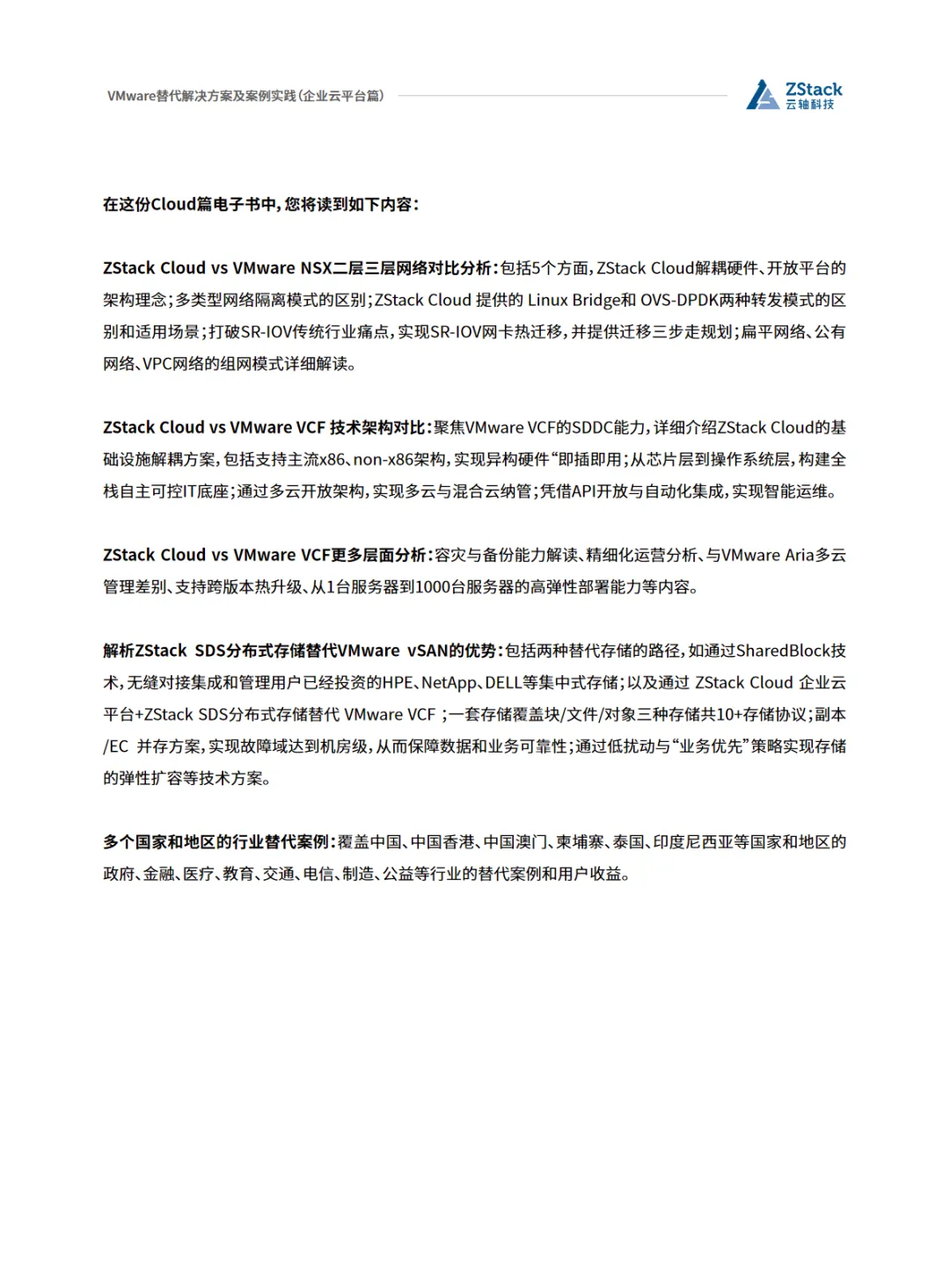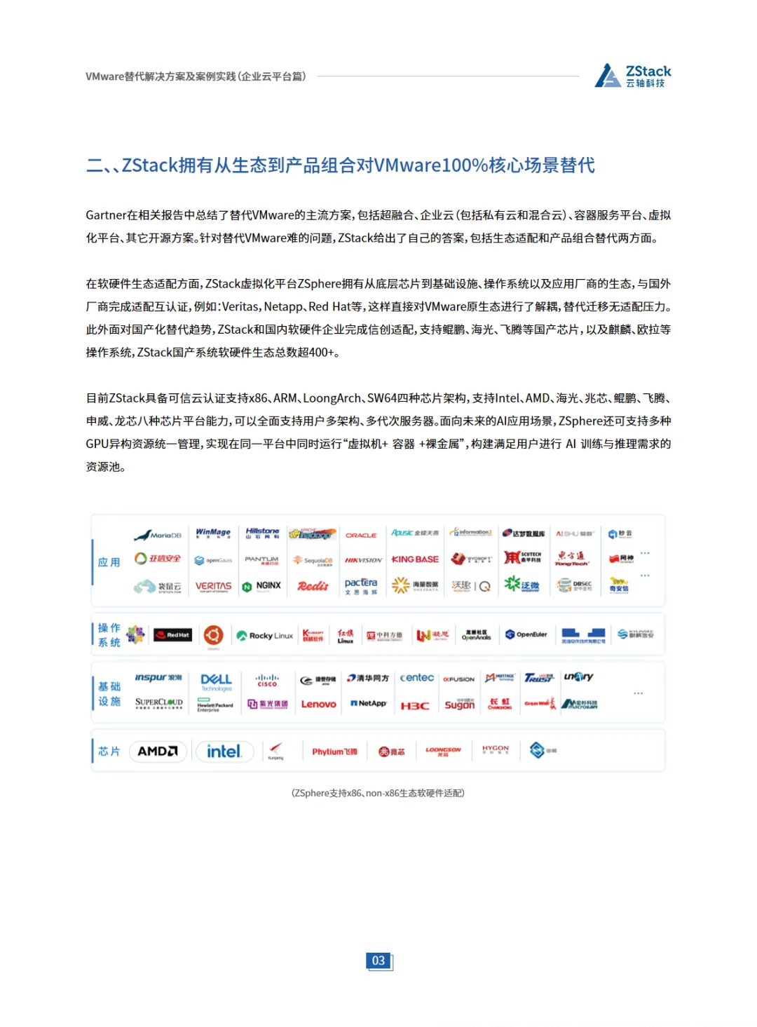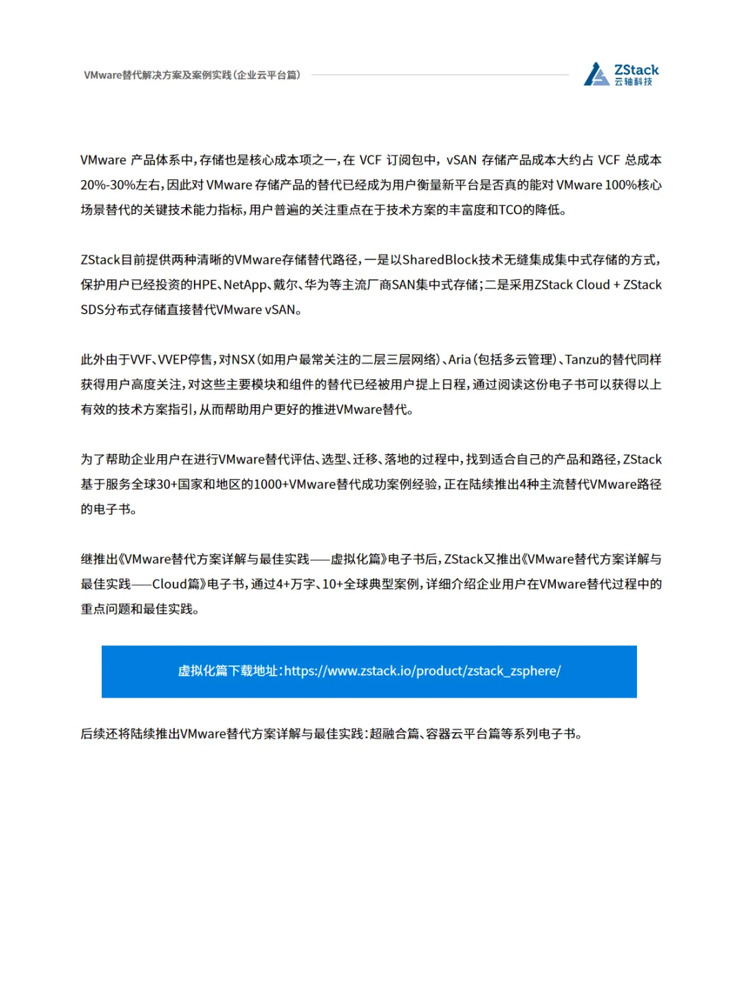 本篇行业报告可以通过扫下方知识星球下载。39元就可以下载星球所有报告。免费提供报告查找服务。随着数字化转型的深入,企业对于云平台的需求日益增长。VMware作为云平台解决方案的提供商,虽然技术成熟,但其高昂的成本和封闭的生态系统限制了企业的灵活性和自主性。因此,越来越多的企业开始寻求替代方案,以降低成本、提高效率并实现自主可控。ZStack Cloud作为VMware VCF的有效替代方案,以其高性价比、硬件利旧、国产化适配和灵活扩展能力脱颖而出。ZStack Cloud不仅支持x86架构,还全面支持包括鲲鹏、飞腾在内的国产芯片,适配阿里云和国产数据库,满足政务和金融行业的国产化需求。其全异步架构和无状态服务设计,提升了系统的并发处理能力和稳定性,更适合高访问量场景。在存储架构方面,ZStack Cloud自研的分布式存储(ZStack SDS)支持Ceph、NFS、SAN等多种存储解决方案,实现了性能的突破。在网络虚拟化方面,ZStack Cloud支持VXLAN、VPC、SDN,并提供防火墙、负载均衡等高可用服务,确保业务的连续性和安全性。ZStack Cloud的另一大优势在于其开放的API和生态灵活性,避免了供应商锁定,使得企业能够轻松集成第三方服务和应用。此外,ZStack Cloud的运维效率也得到了显著提升,普通运维人员经过短期培训即可上手,一体化的运维界面(工单/监控/计费)极大提高了运维效率。综上所述,ZStack Cloud以其开放的架构、灵活的场景适配、高效的运维管理以及对国产化生态的全面支持,成为企业在VMware替代方案中的优选。在全球范围内,ZStack已经拥有1000+成功案例,覆盖金融、政府、运营商等多个行业,证明了其作为VMware替代方案的可靠性和有效性。免责声明:以上分享报告为公开合法渠道获得,内容大部分来源于网络,版权归原作者所有,如有侵权,请及时与我们联系,我们将第一时间保障您的权益。推荐内容仅供参考学习,不构成投资建议。