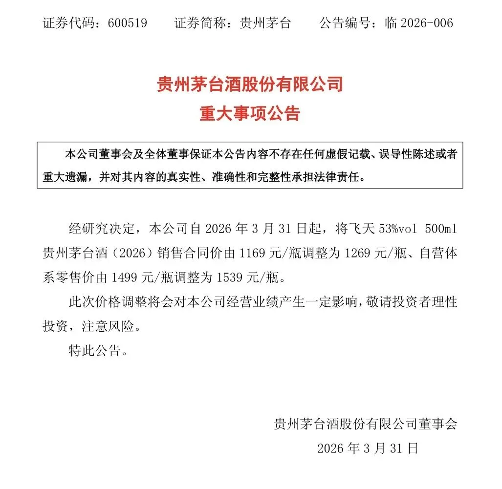 2,飞天茅台的价格,自3月31日开始,又一次涨价。经销商渠道合同价格由1169元涨到1269元;自营体的价格由1499元涨到1539元。