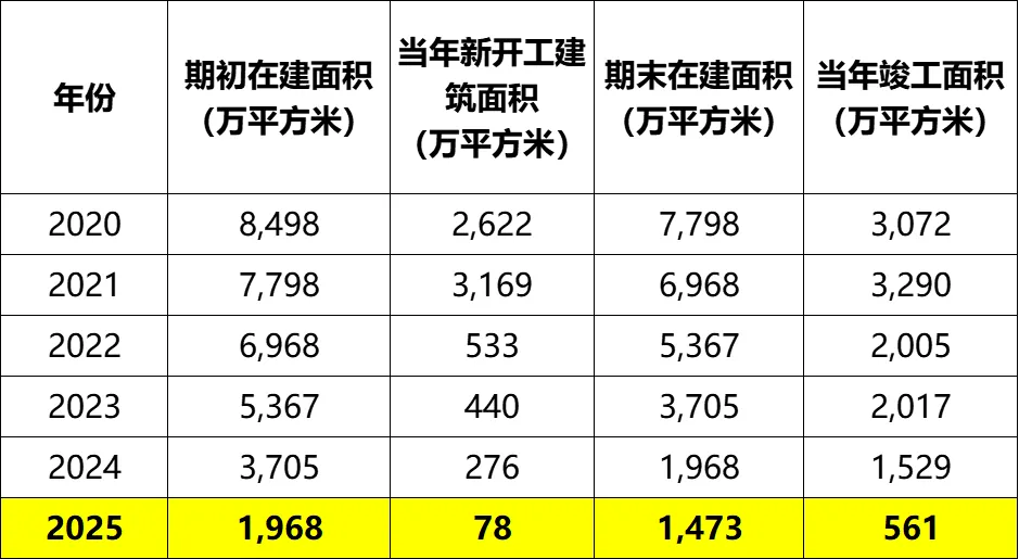 2025年年末在建面积1473万平方米,2026年计划开工20多万平方米,合计在建1500万平方米左右。比2024年2200多万平方米的新开工+在建,也下降了30%多。