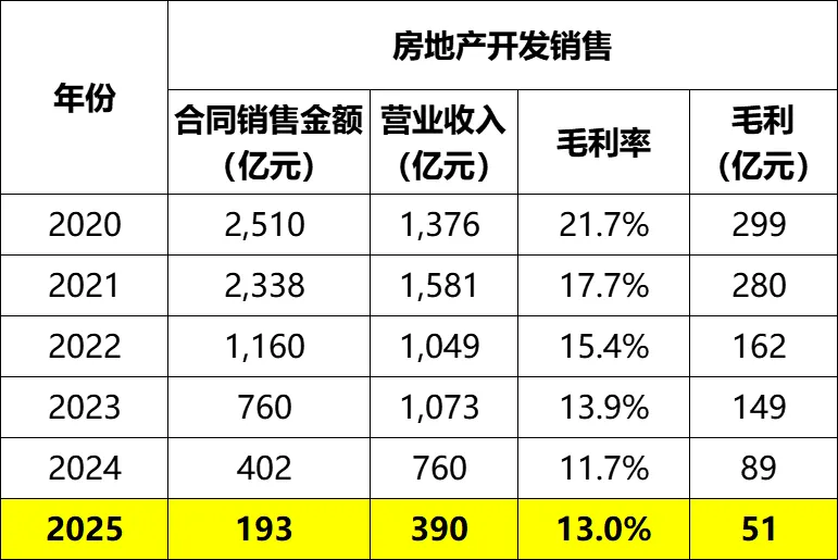 房地产开发业务方面,2025年合同销售金额193亿,比去年腰斩。结转营业收入390亿,也基本腰斩了。