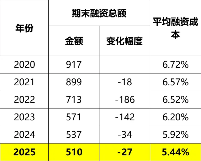 2025年融资总额510亿,较2024年下降27亿,融资成本5.44%。融资成本虽然下降慢,但下降总归是好的。