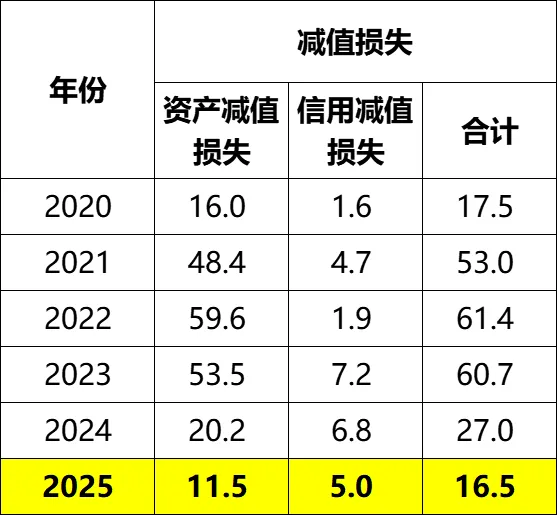 2025年资产减值损失计提11.5亿,2020~2025年累计计提209亿;2025年信用减值损失计提5亿。