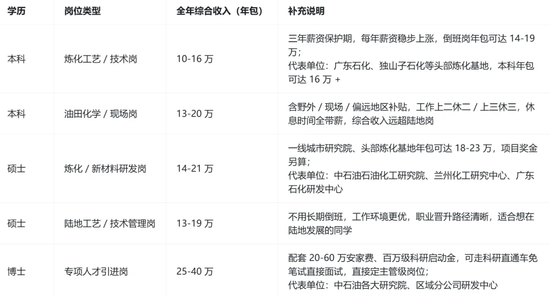 黑龙江大庆、甘肃兰州、四川、陕西等炼化基地、油田分公司,岗位多、补贴高,本科年包 13 万 +,硕士年包 16 万 +; - 第三梯队(稳定高性价比)
