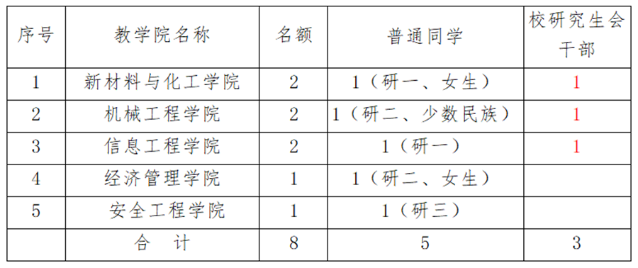 (2)代表名额及构成。根据代表人数不低于研究生会员人数的1%的原则,第一次研代会设立代表人数为8人。结合代表构成要求,研究生会干部代表占40%,女生代表不低于25%,少数民族代表不低于5%以及代表要覆盖各个教学院和年级等,各教学院选举产生的代表名额如下: