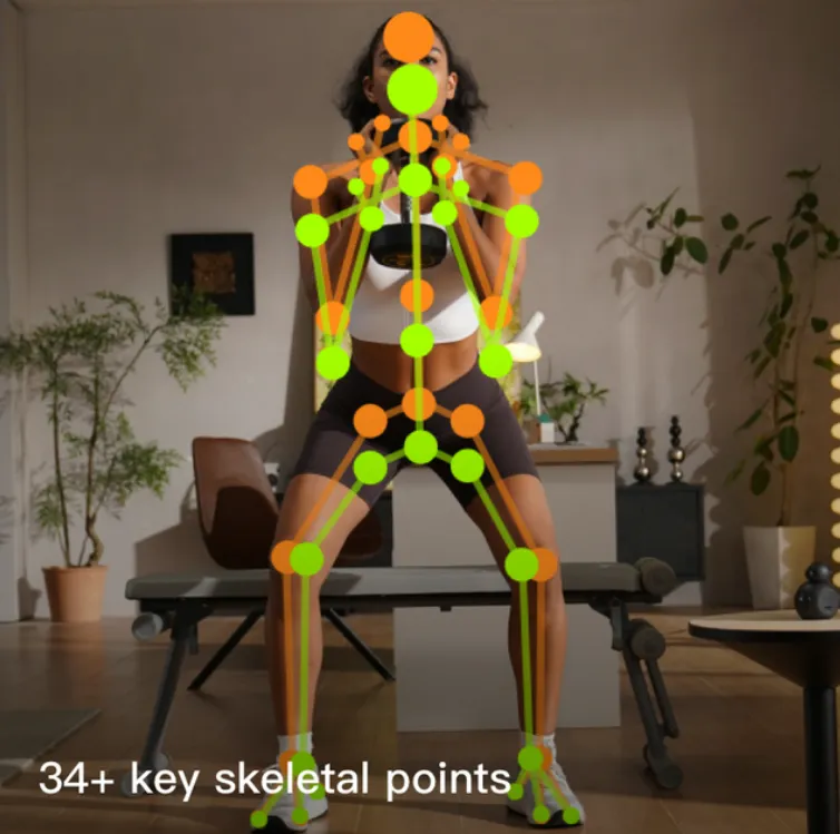 这台设备内置摄像头与自研算法,可实时捕捉34个以上人体骨骼关键点,识别超过2000种运动动作——从瑜伽到力量训练,从有氧到拉伸,几乎全覆盖。训练中,AI通过语音和屏幕提示实时纠错,还会给出动作评分,让枯燥的训练多了一点“游戏感”。