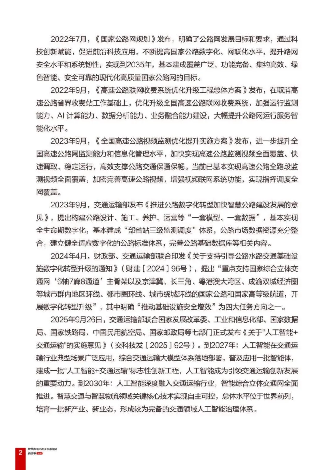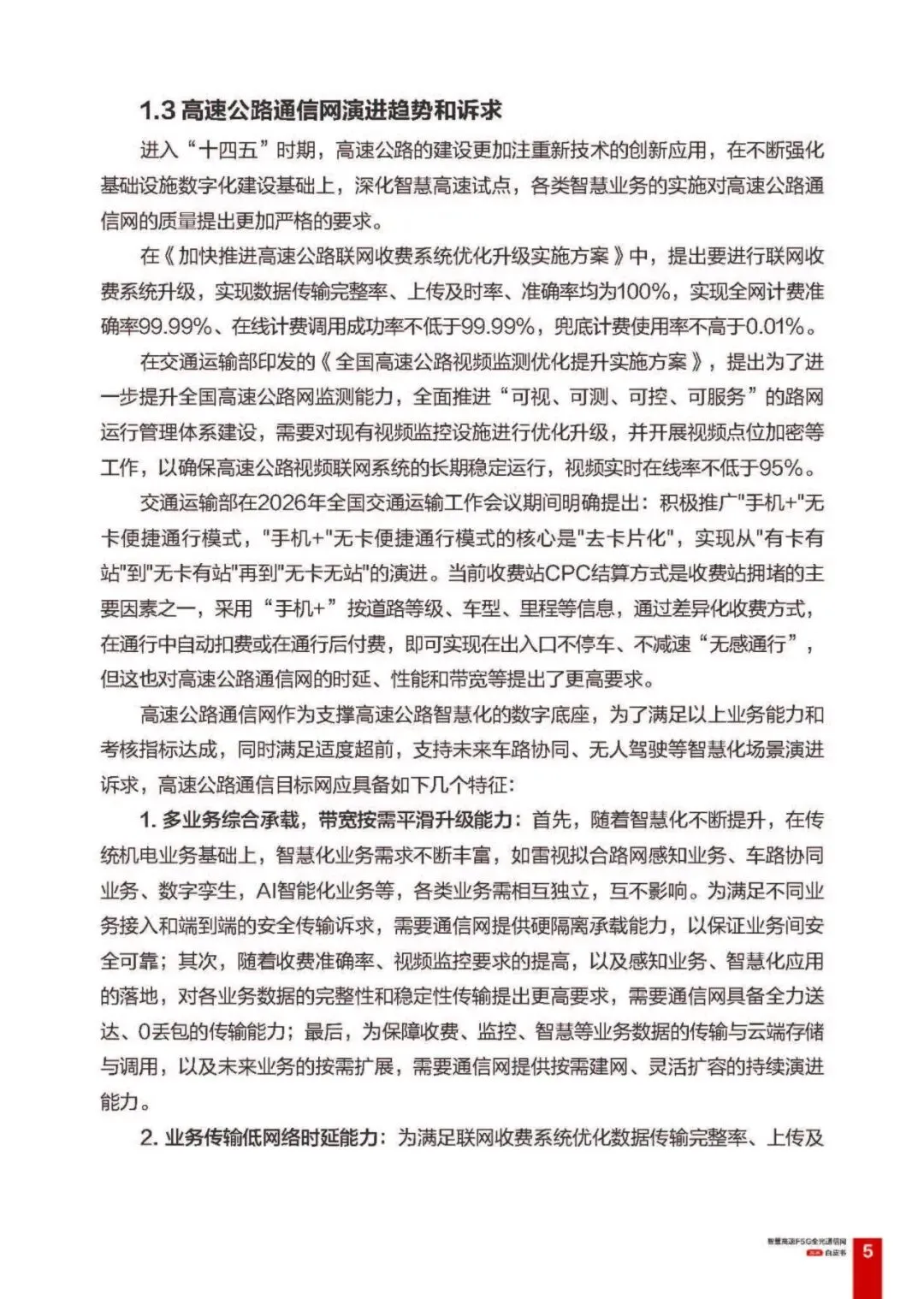 这份《智慧高速 F5G 全光通信网白皮书 2026》由华为发布,立足我国高速公路数字化、智能化发展需求,在 2024 版基础上结合新国标和交通基础设施数字化升级要求,系统阐述了 F5G 全光通信网作为智慧高速数字底座的技术体系、解决方案、应用案例及未来展望,为高速公路通信网升级和交通强国建设提供技术支撑,且编写过程得到了全国多地交通、通信领域设计研究院及企业专家的指导。以下是核心内容总结: