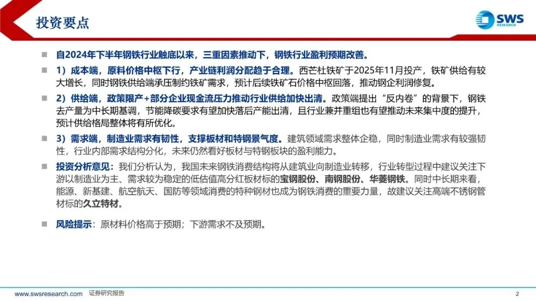 自2024年下半年钢铁行业触底以来,三重因素推动下,钢铁行业盈利预期改善。