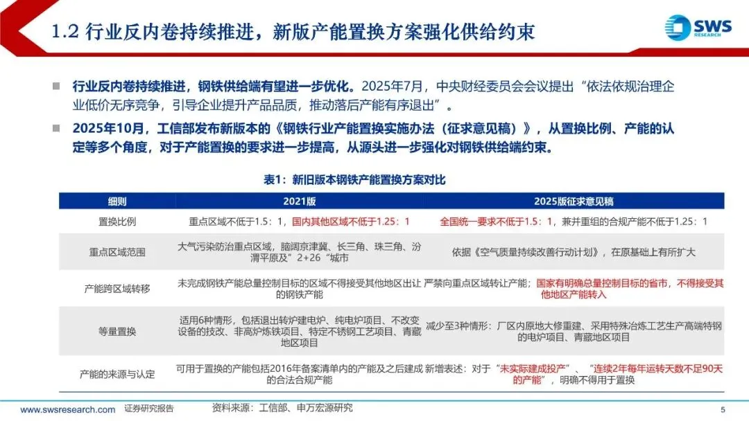 2)供给端,政策限产+部分企业现金流压力推动行业供给加快出清。政策端提出“反内卷”的背景下,钢铁去产量为中长期基调,节能降碳要求有望加快落后产能出清,且行业兼并重组也有望推动未来集中度的提升,预计供给格局整体将有所优化。