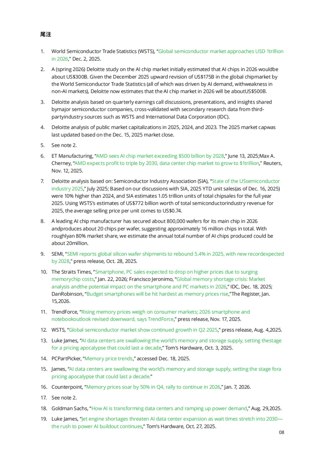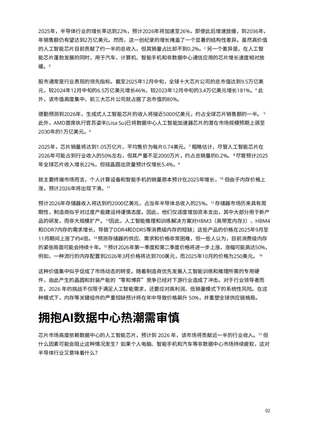 德勤2026全球半导体行业趋势报告指出,2026年全球半导体行业销售额将达9750亿美元,迈向万亿规模,人工智能成为核心增长引擎,但行业发展也呈现出显著的结构性特征与发展新趋势。AI芯片贡献了行业约一半的收入,2026年生成式AI芯片收入预计接近5000亿美元,但其销量占比不足0.2%,与汽车、消费电子等领域芯片增长放缓形成鲜明对比,同时全球十大芯片公司市值大幅增长且高度集中,前三大企业占据八成市值。