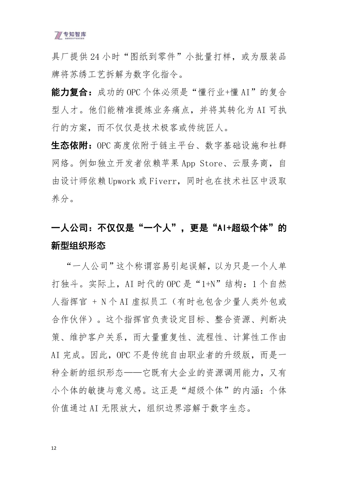传统法律层面的OPC早在1925年就已出现,本质是单一自然人有限责任公司,只是传统公司的最小化复制,效率受自然人时间、精力的物理限制,核心诉求就是获得有限责任的法律保护。而现在AI时代的OPC完全不一样,它突破了法律主体的局限,以当下热门的AI大模型、算力等基础设施为支撑,是“1个自然人指挥官+N个AI虚拟员工”的人机协同形态,能达到传统百人、千人组织的效能。它不用局限于法律意义上的一人公司,也可以是没有法人资格的独立创业者,本质是“AI+超级个体”,和传统公司、自由职业者都不是一回事。