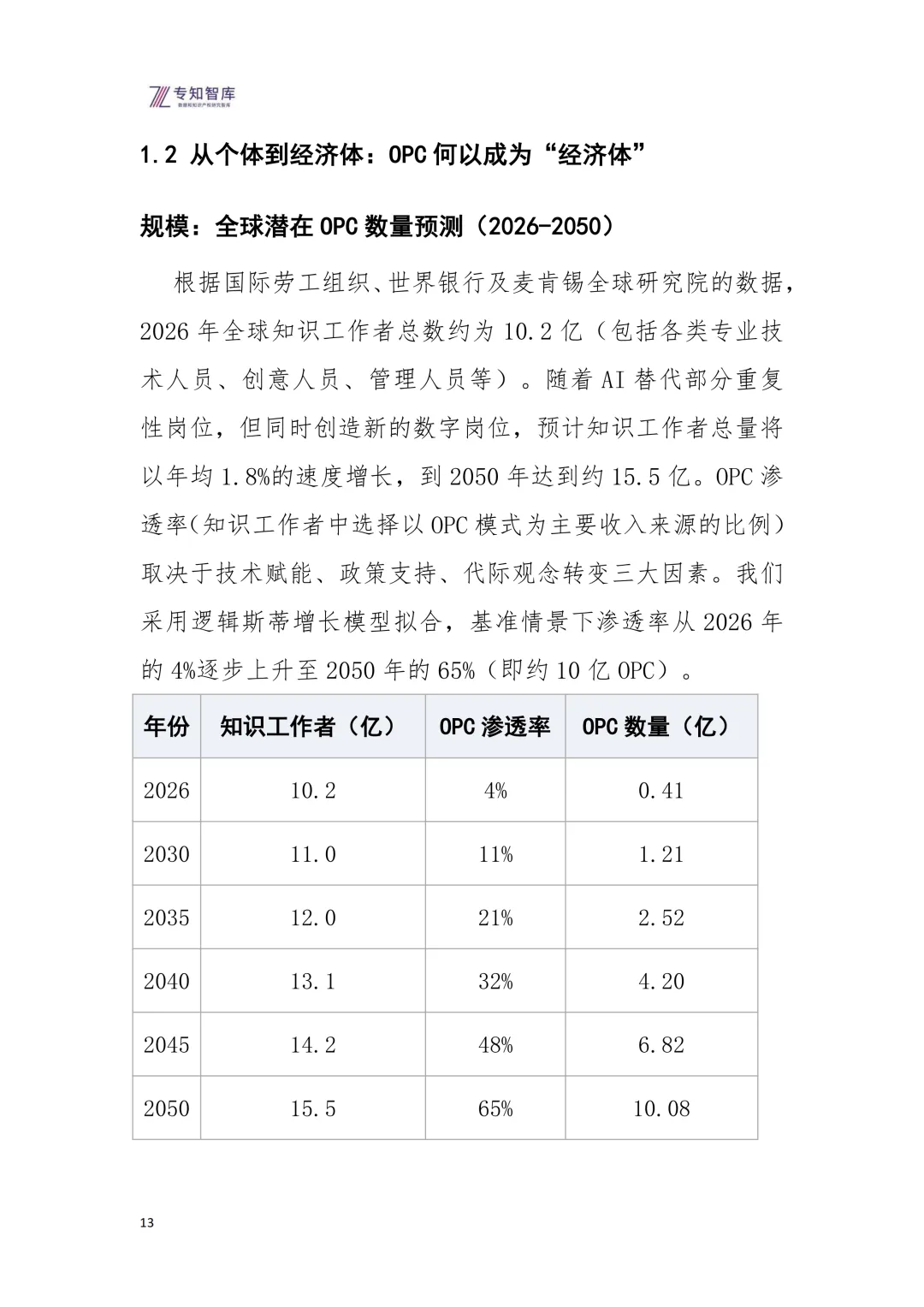 要实现2050年10亿OPC、贡献65%全球GDP的目标,核心得满足五个条件。首先AI技术得持续进步,大模型、算力、数据这三大基础设施要持续普惠,AI效率增益因子能按预期从1.0升到3.2,不能出现技术停滞。其次政策制度要跟上创新,各国得明确OPC的法律地位,完善社保和税收体系,2030年前要实现社保对OPC的有效覆盖,适配当前全球产业链重构的趋势。再者年轻一代的价值观要转变,Z世代、α世代对独立工作的接纳度要不断提高,让OPC渗透率稳步增长。还有全球知识工作者规模要稳步扩大,2050年达到15.5亿,不能因为自动化出现大规模萎缩。最后全球经济和生态要稳定,GDP保持年均2.5%的温和增长,避免地缘政治、经济危机的重大冲击,缩小数字鸿沟,让OPC的全球协作网络能顺利完善。