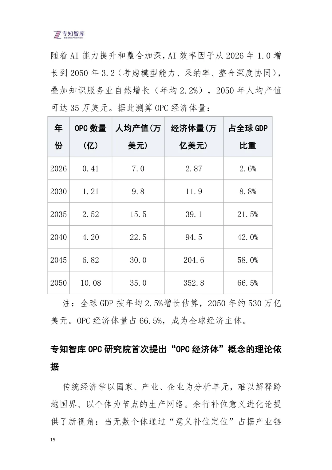 《全球 OPC 经济体发展白皮书(2026)》首次系统性界定了OPC经济体概念,明确AI时代OPC是以AI为生产力基础设施、人机协同的精益型组织,以余行补位意义进化论为核心理论,搭建了GODI度量框架。白皮书梳理了技术、平台、政策、人才四大核心驱动力,指出北美、欧洲、亚太是全球OPC发展核心区域,中国长三角为典型实践,同时分析了其产业价值与现存挑战,预测到2050年全球OPC数量将达10亿家,贡献65%的全球GDP。在当前全球经济碎片化、AI技术快速迭代的背景下,OPC经济体将从产业链补位者成长为全球经济主体,推动工作与组织形态变革,最终实现技术回归人性的文明价值。