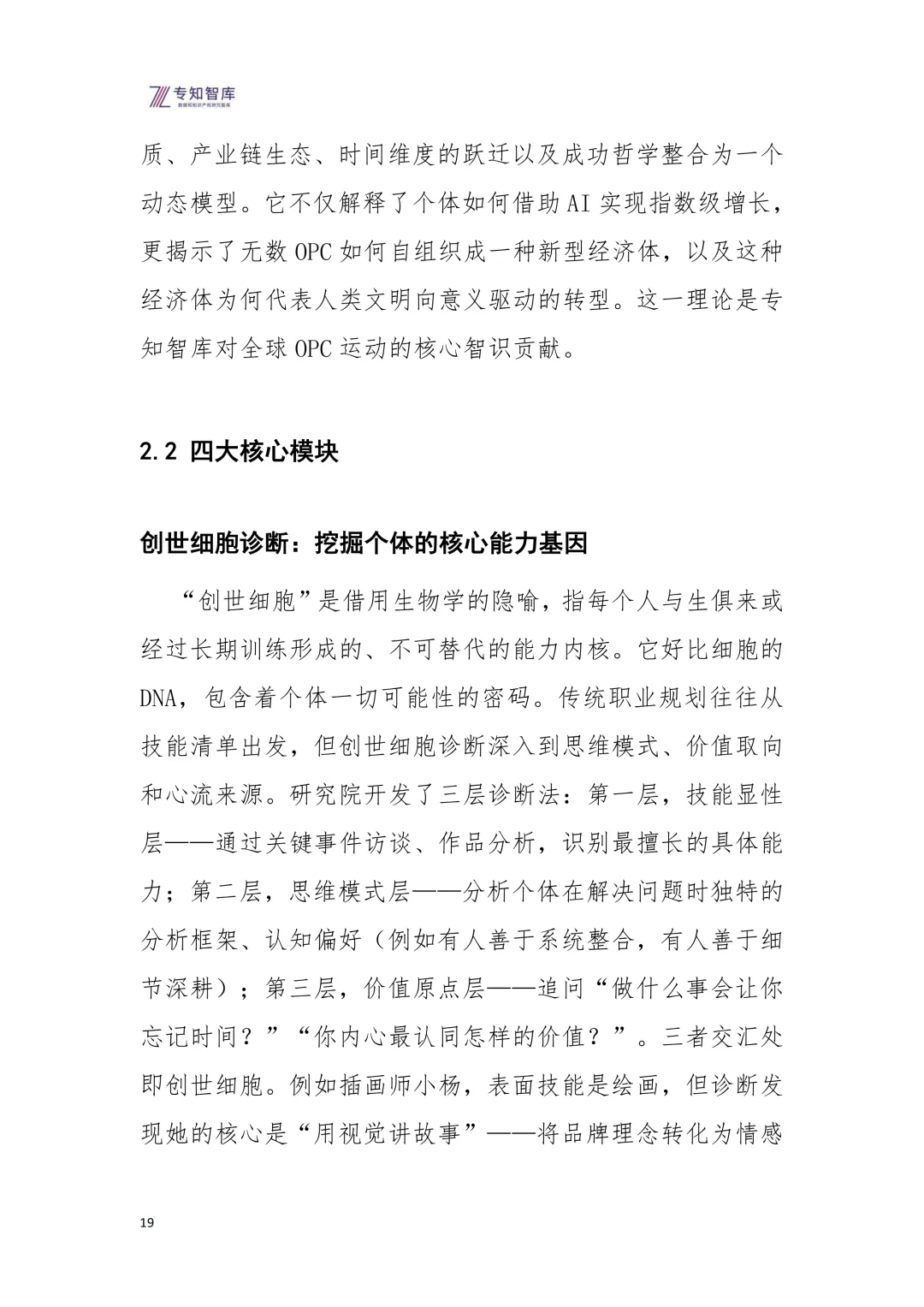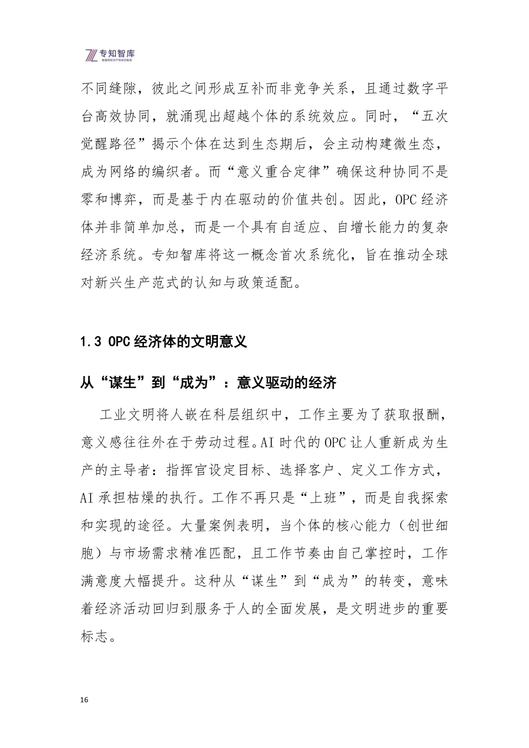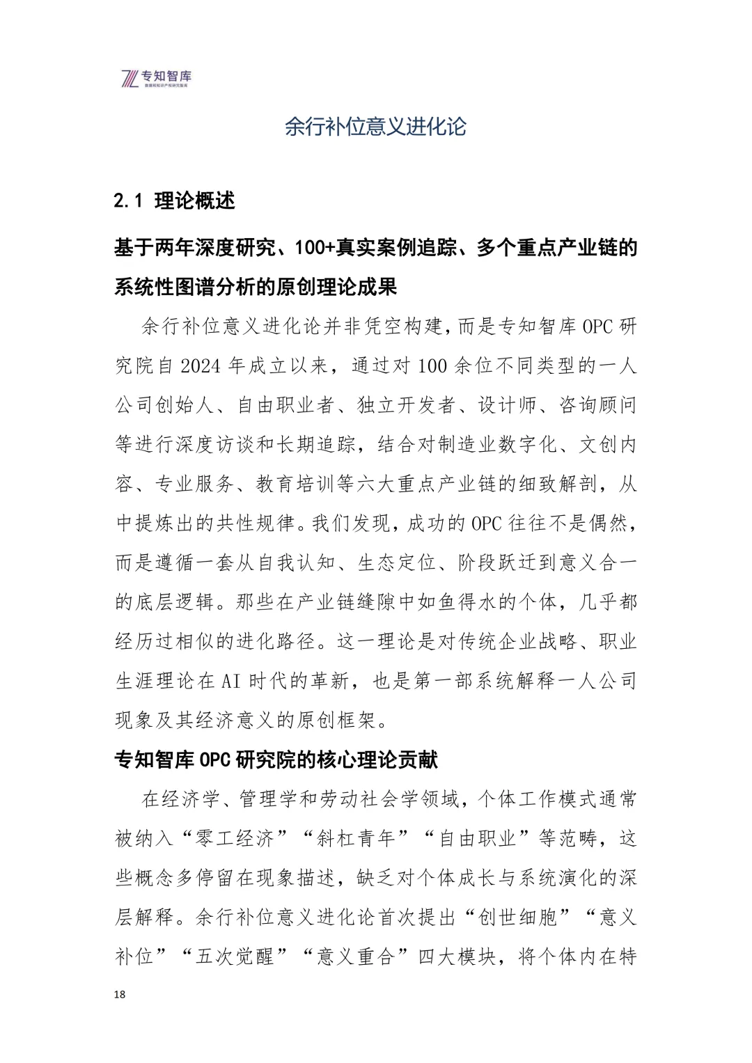 其实这四个模块是从个体到系统逐步推进的。先通过创世细胞诊断找到个体的核心能力,这是OPC的基础,保证了每个个体的独特性和竞争力。接着靠意义补位定位,让众多OPC在产业链中找到各自的差异化生态位,形成互补而非竞争的格局,这就为经济体的分工网络打下了基础。然后通过五次觉醒路径,推动OPC从单个个体成长为能构建微生态的主体,成功的OPC会把部分工作分包给其他OPC,形成上下游协作,让个体网络不断扩大。最后靠意义重合定律,让OPC之间的协作基于意义驱动,追求长期共赢,降低交易成本,让整个网络具备自组织、自修复的能力,慢慢从个体集合发展成完整的OPC经济体。