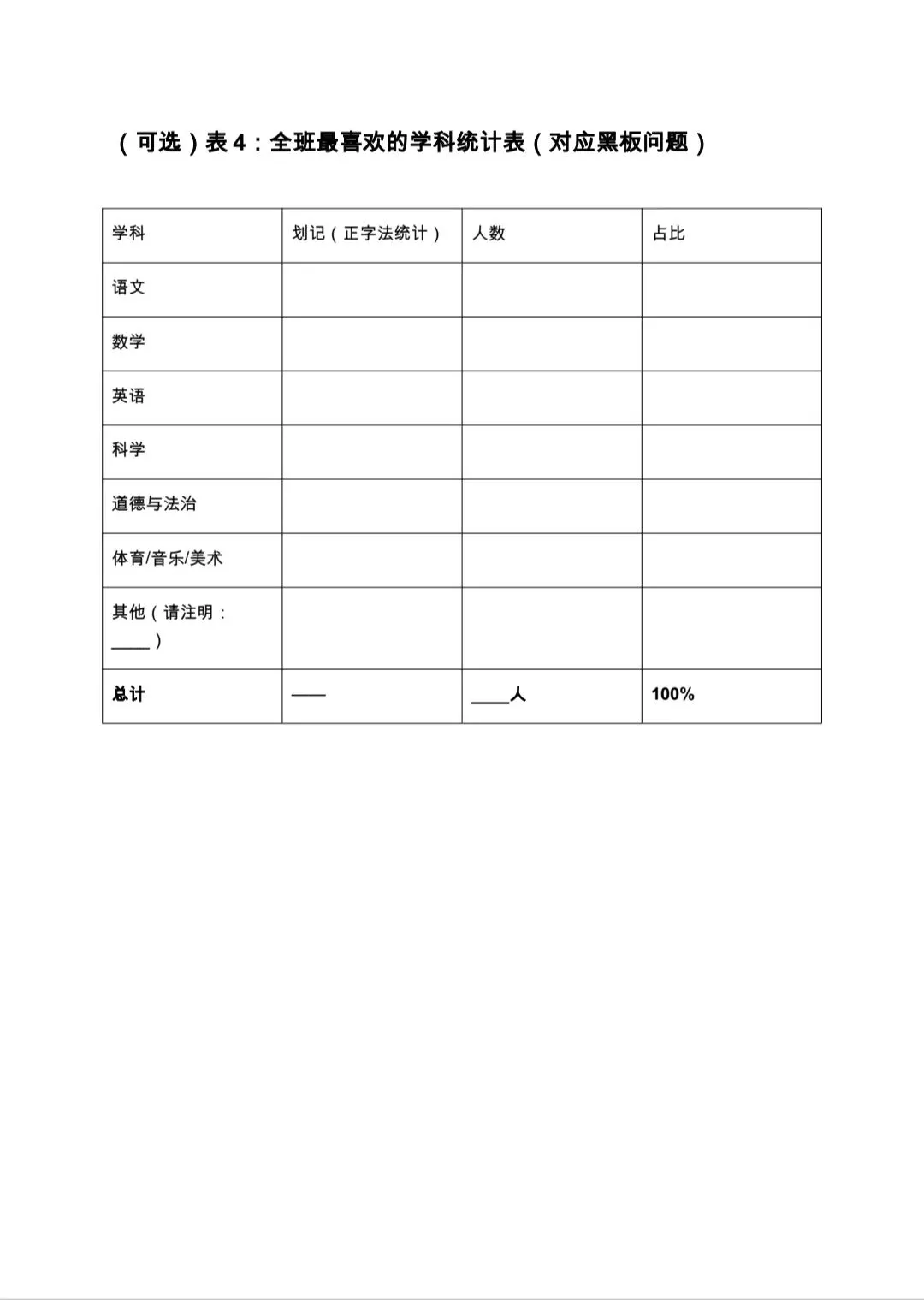 接下来,就该学生上场了。大家也跃跃欲试,一双好奇的眼睛盯着我,就等一声令下。为了让统计有序进行,我实行分组,以师徒为一组,6个组分别调查6个班级,还剩2个班,就让能力强、调查的班级人数少的师徒俩去调查。