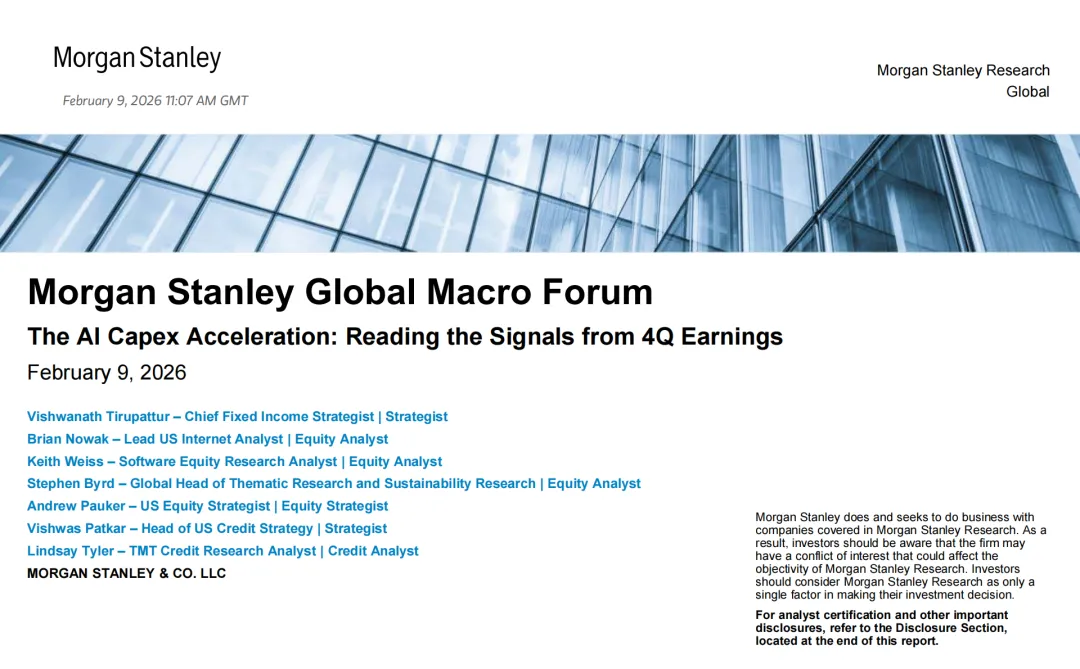 摩根士丹利于 2026 年 2 月 9 日发布 AI 资本支出相关研究报告,结合四季度财报信号分析全球 AI 行业发展现状,上调 2026-2027 年 AI 相关资本支出预期,从算力供需、价值创造、资本市场等多维度解读 AI 行业发展趋势。