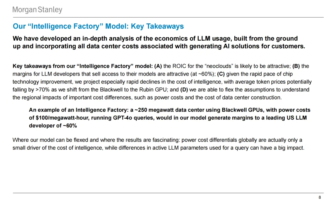 报告指出当前 AI 行业核心呈现算力供需严重错配、价值创造空间巨大的现状,且技术能力正快速逼近人类水平。算力端,谷歌高管预测的算力需求约为摩根士丹利对英伟达算力复合年增长率预测的 3 倍,周度代币使用量一年暴涨约 2200%,AI 任务复杂度非线性提升、行业应用持续拓宽进一步加剧算力缺口;价值端,智能体 AI 和实体 AI 带来的价值创造市场规模合计占标普 500 指数 2026 年调整后税前利润的 25% 以上;技术端,Claude Opus 4.1 已在 48% 的人类任务中表现优于人类,预计 2026 年美国五大头部企业大模型训练算力提升 10 倍后,AI 能力将实现快速突破。同时,摩根士丹利搭建的 “智能工厂” 模型显示,新型云服务商资本回报率可观,大模型开发商模型访问销售利润率达 60%,从 Blackwell 切换至 Rubin GPU 后,代币平均价格或下跌超 70%。