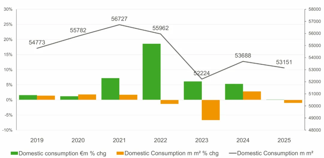 2025年欧洲软包装市场消耗量约为531.51亿平方米,较2024年的536.88亿平方米略有下滑。从价格端来看,原材料整体价格在高位之后回落——BOPP、BOPA、PET膜等主流薄膜均出现价格下调,PE和LDPE也处于相对疲软状态。