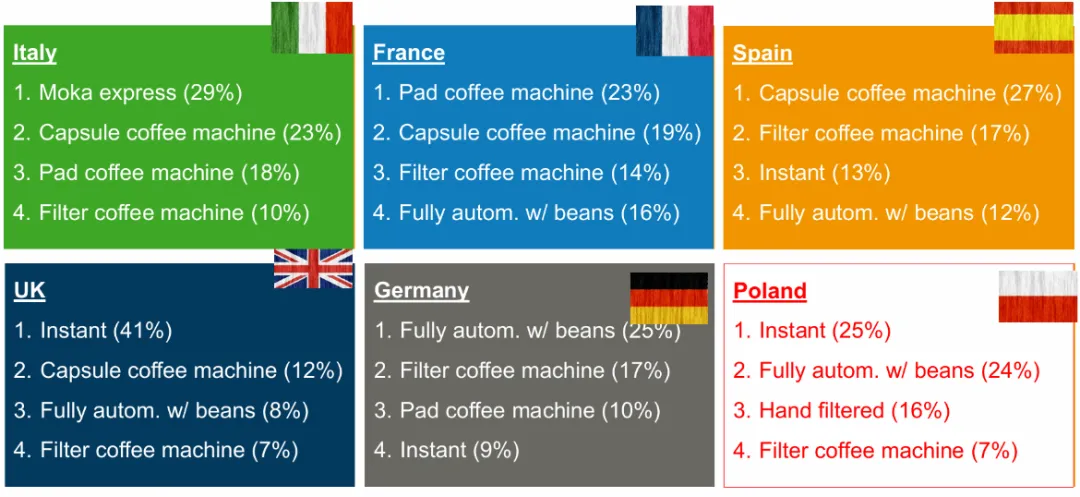 六国消费者咖啡制作方式偏好:各国习惯差异显著,英国速溶、意大利摩卡、德国全豆各有所爱。