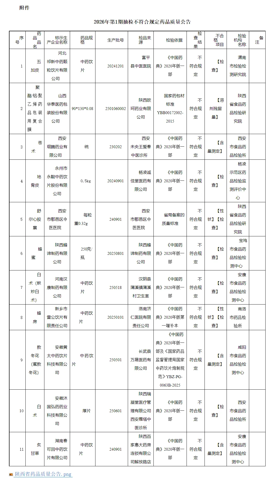 为加强药品监管,保障公众用药安全,省药品监督管理局组织全省各级药品监管部门开展药品抽检。现将抽检发现的不符合规定11批次药品予以公告,不符合规定项目主要为性状、检查、含量测定。