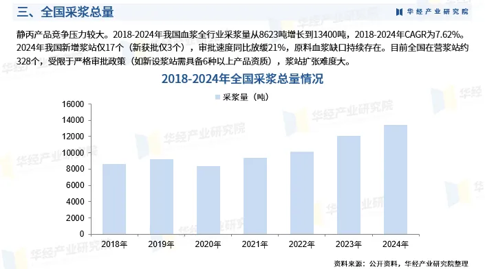 静丙产品竞争压力较大。2018-2024年我国血浆全行业采浆量从8623吨增长到13400吨,2018-2024年CAGR为7.62%。2024年我国新增浆站仅17个(新获批仅3个),审批速度同比放缓21%,原料血浆缺口持续存在。目前全国在营浆站约328个,受限于严格审批政策(如新设浆站需具备6种以上产品资质),浆站扩张难度大。
