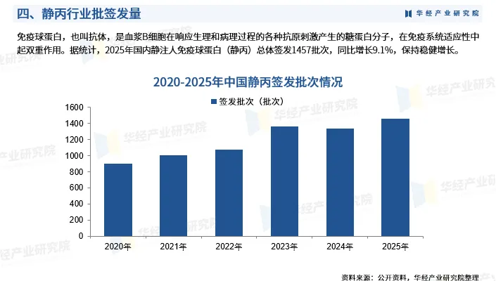 免疫球蛋白,也叫抗体,是血浆B细胞在响应生理和病理过程的各种抗原刺激产生的糖蛋白分子,在免疫系统适应性中起双重作用。据统计,2025年国内静注人免疫球蛋白(静丙)总体签发1457批次,同比增长9.1%,保持稳健增长。