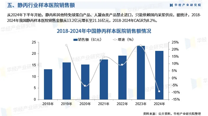 从2024年下半年开始,静丙和其他特免球蛋白产品、人凝血类产品禁止进口,只能依赖国内采浆供应。据统计,2018-2024年我国静丙样本医院销售金额从13.2亿元增长至21.16亿元,2018-2024年CAGR为8.2%。