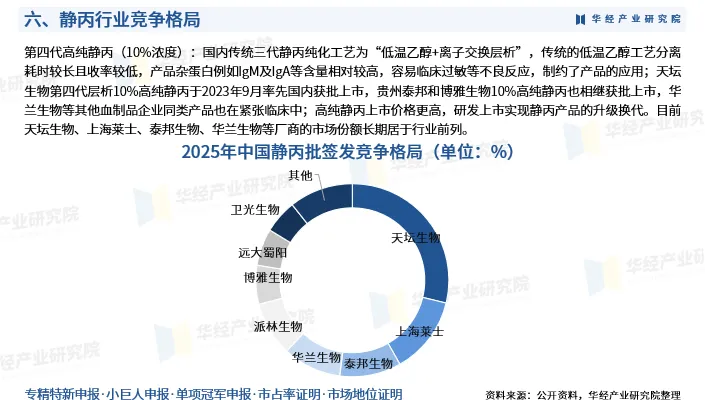 第四代高纯静丙(10%浓度):国内传统三代静丙纯化工艺为“低温乙醇+离子交换层析”,传统的低温乙醇工艺分离耗时较长且收率较低,产品杂蛋白例如IgM及IgA等含量相对较高,容易临床过敏等不良反应,制约了产品的应用;天坛生物第四代层析10%高纯静丙于2023年9月率先国内获批上市,贵州泰邦和博雅生物10%高纯静丙也相继获批上市,华兰生物等其他血制品企业同类产品也在紧张临床中;高纯静丙上市价格更高,研发上市实现静丙产品的升级换代。目前天坛生物、上海莱士、泰邦生物、华兰生物等厂商的市场份额长期居于行业前列。