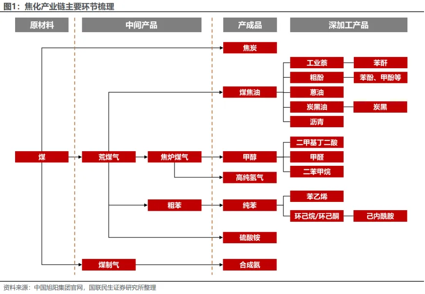 焦化产业主产品为焦炭,副产品主要包括煤焦油、甲醇、纯苯等。焦化行业以煤炭为原料,主要产出品为焦炭,1吨焦炭约耗煤1.3~1.4吨,同时副产煤焦油、甲醇、纯苯等产品,其经过深加工,还可以进一步产生工业萘、蒽油、甲醛、苯乙烯、己内酰胺等产品。