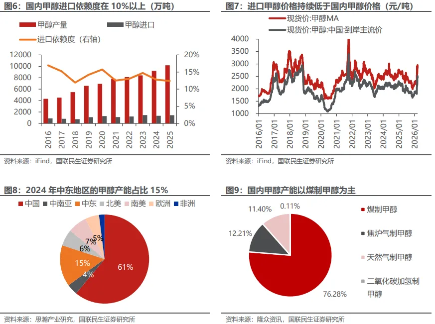 国际甲醇生产以气头为主,低成本导致国内甲醇盈利较差,行业受进口冲击、进口依赖度持续在10%以上。2025年,国内甲醇产量10182万吨、进口1441万吨,由于国际进口甲醇价格持续低于国内,甲醇的进口依赖度保持在10%以上,其中,我国从伊朗的甲醇进口占比约60%。伊朗的甲醇生产主要以天然气为原料,且伊朗的天然气开采成本较低,是甲醇进口比例居高不下的主要原因。据iFind数据,2016年初至2026年3月25日,进口甲醇均价相比国内均价低445元/吨,相当于国内甲醇均价的18.2%。