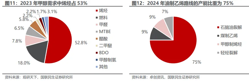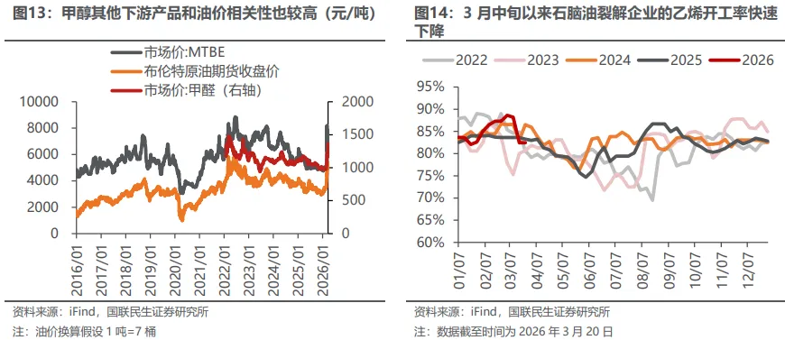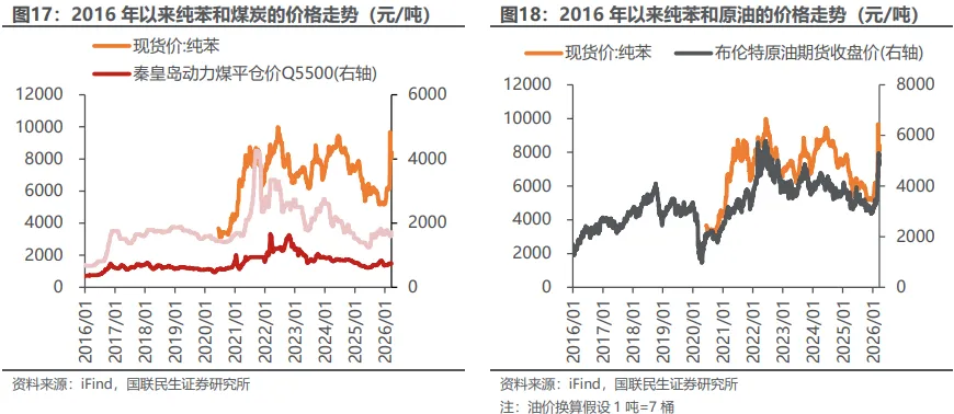 1)甲醇:供给端,美以伊局势升级背景下,甲醇供给或面临大幅收缩,①伊朗封锁霍尔木兹海峡将中断全球约35%的海运甲醇贸易;②伊朗是全球第二大甲醇生产国、其甲醇生产以气头为主,而以色列袭击的伊朗南帕尔斯气田产量占其天然气产量的80%以上、且该地区天然气供应伊朗近80%的甲醇生产;③伊朗的甲醇产能约1760万吨、占全球的9%、占中东地区的63%,是第二大甲醇生产国,作为地缘冲突的主要参与方,伊朗的甲醇生产或一时难以恢复。需求端,油价上涨阶段,甲醇下游烯烃等价格上升,需求向好。甲醇供应受损,叠加需求端油价推涨的传导逻辑,甲醇价格弹性或高于油价。2)煤焦油:一方面可以通过加氢处理转化为柴油、汽油等燃料,另一方面可以通过深加工得到多种化合物,如萘、酚、蒽等。因此,作为原油产成品的重要替代品,煤焦油受油价影响较大。3)苯:以油制路线为主,2023年国内苯产量为2311万吨,其中,以原油为原料通过催化重整、乙烯裂解、甲苯歧化等方式制作的石油苯占比83%,以煤炭为原料制作的加氢苯占17%。因此,作为原油的重要衍生产品,苯受油价影响较大。
