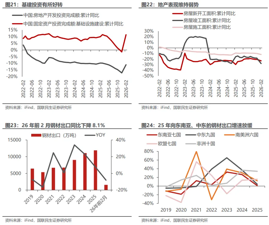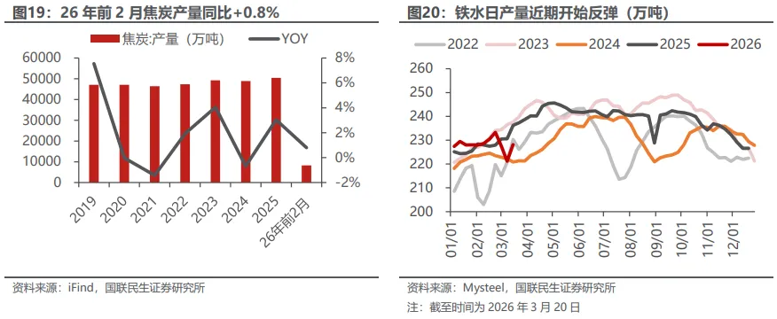 据“十五五”规划纲要,我们预计国家对焦化行业的总量管控力度将进一步加强,2026年国内新增焦化产能约1028万吨,远低于“十四五”的年均增量2351万吨和2025年的增量1945万吨,因此行业供给增速有望显著放缓。从2026年情况来看,内需方面,国内地产表现持续低迷,基建投资增速回暖对需求形成一定支撑,2026年前2月,国内焦炭产量8255万吨,同比增长0.8%,据mysteel数据,同期铁水产量约14427万吨,同比增长0.9%;海外方面,考虑到全球对华钢铁贸易反倾销案件数量增加,以及国内于2026年重启钢材出口许可证管理,钢材出口增速或将放缓。预计2026年焦化行业供需弱平衡,行业普遍盈利困难。因此,我们预计未来焦炭价格基本随焦煤价格波动,即使焦煤涨价,也将由焦炭传导,副产品加工环节无明显的成本压力。
