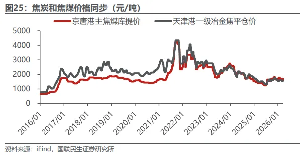 受新增产能和铁水需求驱动,25年焦炭产量有所增长。2025年,我国焦炭产量为5.04亿吨,同比增长3.0%。一方面,国内2024年新增焦化产能2602万吨、淘汰产能1626万吨、净增976万吨,2025年新增、淘汰、净增产能分别为1945、1792、153万吨,截至2025年末,我国焦化生产企业约300余家,其中,独立焦企210余家、钢厂配套焦化企业90家左右,焦炭总产能约5.70亿吨(去除掉长期停产但并未拆除焦炉产能);另一方面,2025年需求端铁水产量表现较好,据mysteel数据测算,2025年全国铁水产量8.86亿吨,同比增长1.1%。