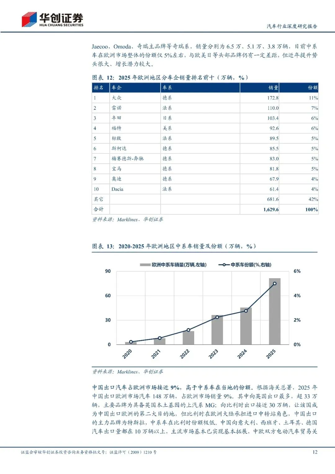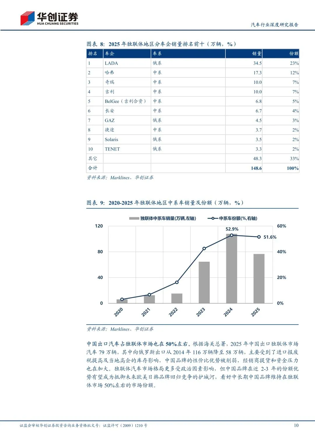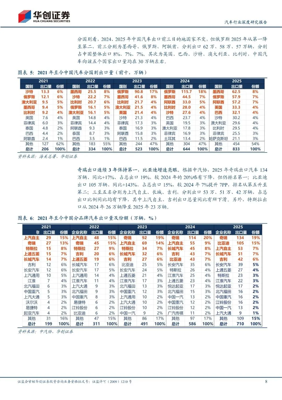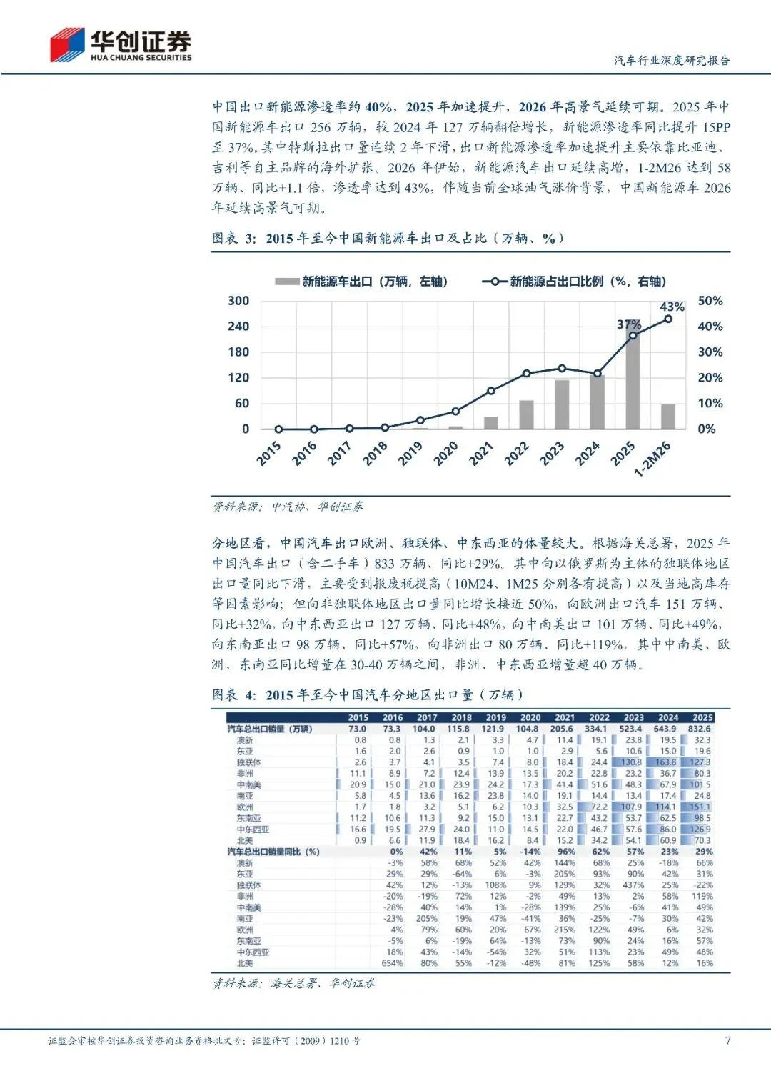 中国汽车出口已连续5年实现100万辆级增量。中国汽车出口指是速始于2021年,一方面是海外供应链错配带来突破瓶颈的机会,另一方面中国自主新车凭借智能电动彰显性价比,渠道及售后的完善等优势也持续显现,两方面共同带来海外增长的良性循环。根据中汽协,2025年中国汽车出口706万辆,同比+21%,同期中国汽车出口占批发比重首次超过20%。1-21M26中国汽车出口135万辆、同比+49%,占批发比重达到33%。预计在未来数年内,出口仍会是汽车销量增长最重要的推动力。