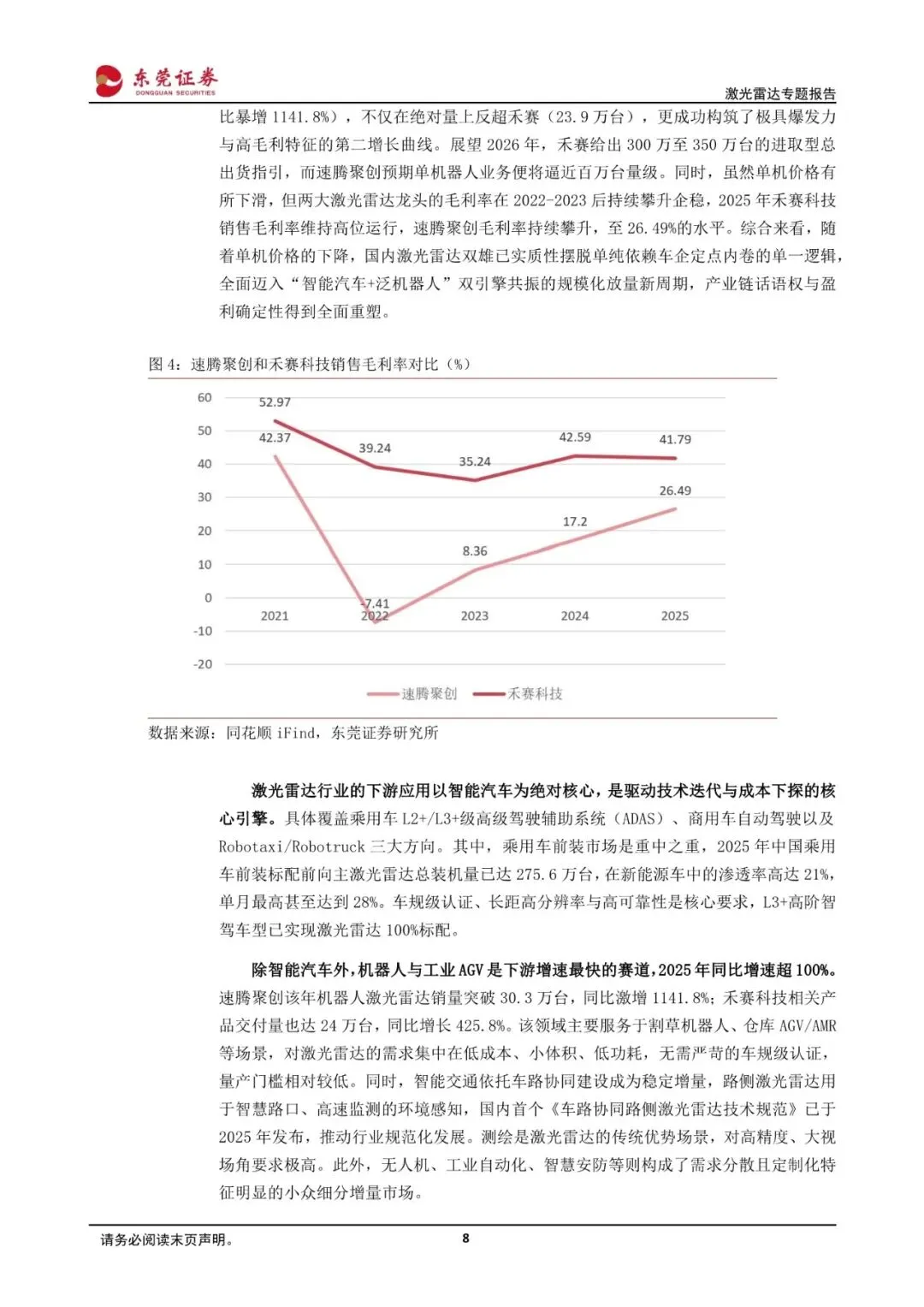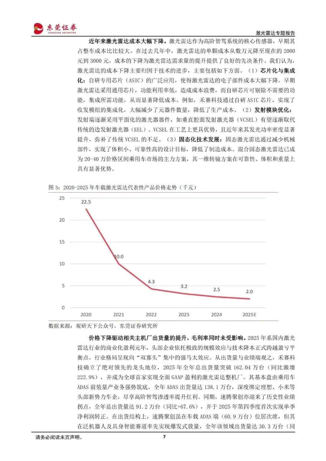 激光雷达是高阶智能驾驶不可或缺的核心传感器,能有效弥补纯视觉在极端光线下的感知短板。近年来,得益于自研ASIC芯片集成化、VCSEL发射模块优化及固态化技术进步,单颗成本已从数万元大幅下探至两三千元区间。成本的大幅下降为大规模普及创造了先决条件,推动行业在2025年正式跨越盈亏平衡点,迎来商业化盈利元年。