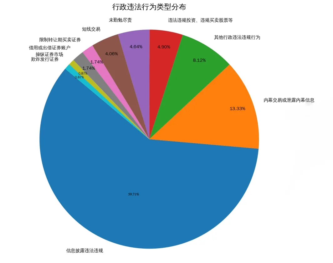 行政风险部分:涉及行政处罚的案件共331起,共包含行政违法行为342起,被处罚对象1101人,其中信息披露违法违规行为数量最多,占比达59.94%。