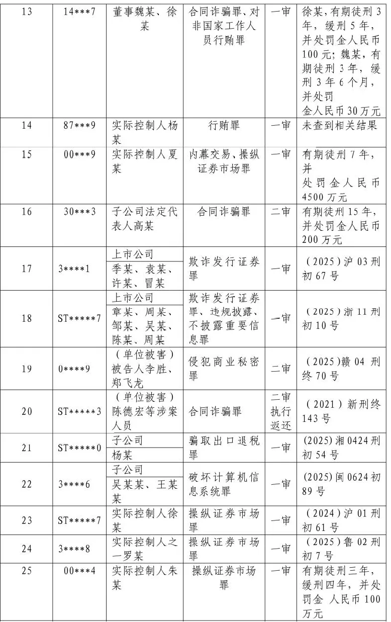 2025年度上市公司相关刑事罪名分布情况
