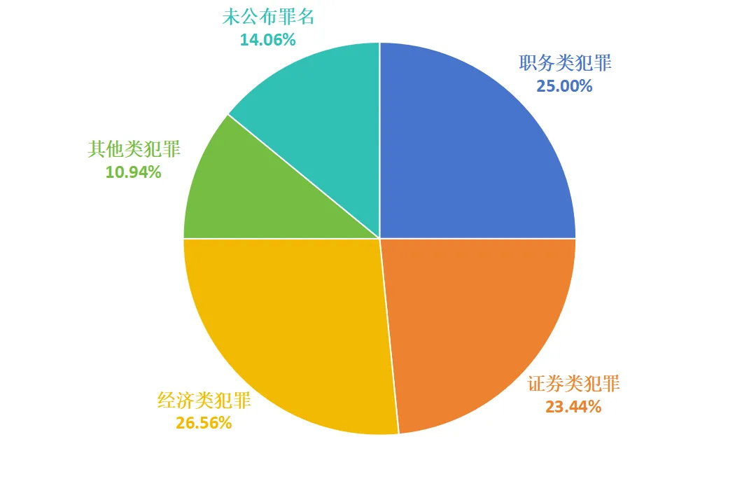 2025年度64起刑事相关案件(已判决/裁定36起、进入诉讼程序28起)共涉及20个罪名。按犯罪类型分类来看,经济类犯罪17起,占比26.56%;职务类犯罪16起,占比25.00%;证券类犯罪15起,占比23.44%;其他类犯罪7起,占比10.94%;未公布罪名9起,占比14.06%。