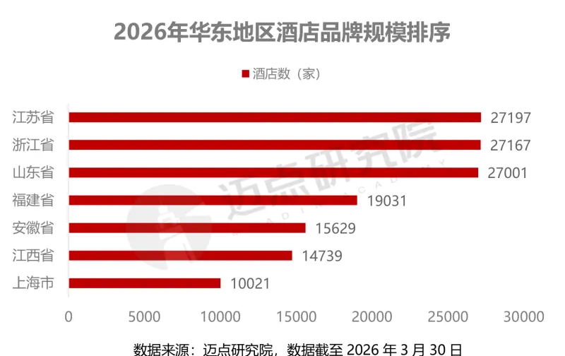 从市场规模来看,安徽省品牌酒店在华东地区占据稳固地位。2026年,安徽省以1.56万家的酒店体量位居华东第5,在华东地区酒店业中扮演着关键角色,正逐步迈向精细化竞争新阶段。
