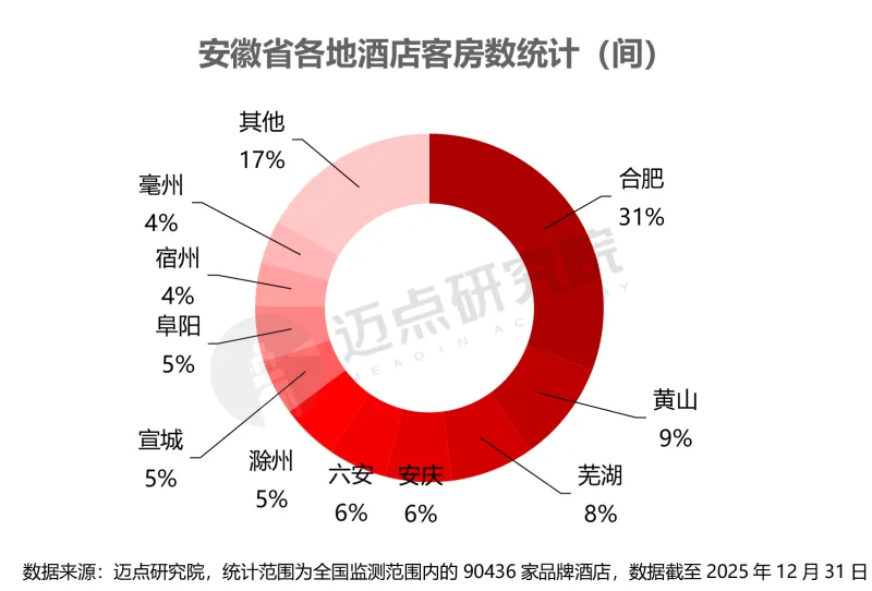 安徽省酒店市场呈现核心城市引领、文旅节点协同的区域格局。从存量客房分布看,合肥以31%的占比稳居全省首位,凭借省会商务枢纽与综合交通优势,成为安徽酒店市场的绝对核心;黄山(9%)、芜湖(8%)紧随其后,分别依托世界级文旅资源与皖江经济带产业优势,形成区域次中心;六安、安庆、滁州、宣城、阜阳等城市各占4%-6%份额,共同构成省内多层次供给网络。