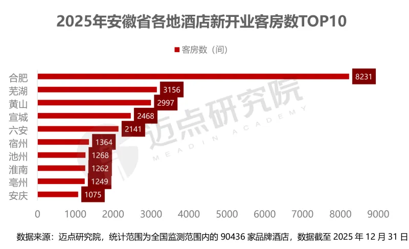 从2025年新增供给来看,区域增长格局与存量分布高度契合,合肥仍为增长引擎,全年新开业客房数达8231间,远超其他城市,展现出强劲的商务与消费吸附力。芜湖(3156间)、黄山(2997间)分别位列第二、三位,延续了文旅与产业驱动的增长态势;宣城(2468间)、六安(2141间)等城市依托县域文旅与本地消费,新增供给稳步提升,形成多点支撑的增长格局。