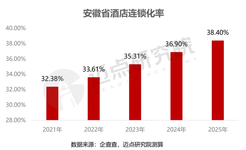 从连锁化率来看,安徽省酒店连锁化进程持续推进,2021-2025年连锁化率从32.38%攀升至38.40%,年均增幅约1.5个百分点,整体保持稳健增长态势。显示出省内单体酒店向品牌化转型的强劲动力。随着酒店集团向三四线城市及县域市场下沉,未来连锁化率仍有较大提升空间,区域不均衡问题也将逐步改善。