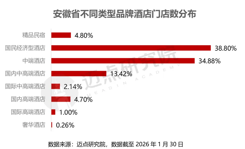 从品牌类型分布来看,安徽省品牌酒店呈现“大众为主、高端稀缺”的格局。国民经济型与中端酒店占据绝对主导,国民经济型酒店占比38.80%,中端酒店占比34.88%,两者合计占比超七成,构成市场核心力量,贴合大众旅游与商务出行需求。本土中高端品牌优势显著,国内中高端酒店占比13.42%,远高于国际中高端酒店(2.14%),本土品牌凭借对本地消费习惯的精准洞察,在中高端市场形成较强竞争力。高端与奢华酒店供给严重不足,国际高端酒店占比仅1.00%,奢华酒店占比低至0.26%,且高度集中于核心城市,合肥、黄山和芜湖等城市之外的文旅目的地高端住宿产品缺口明显,未来随着文旅消费升级,高端市场存在较大发展潜力。精品民宿与国内高端酒店形成补充,精品民宿占比4.80%,国内高端酒店占比4.70%,共同满足细分客群的个性化需求。