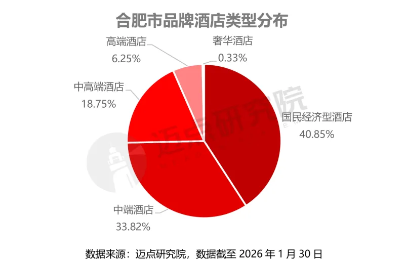 从核心城市合肥的品牌酒店结构来看,国民经济型与中端酒店占据绝对主导,国民经济型酒店占比40.85%,中端酒店占比33.82%,两者合计覆盖超七成市场,主要满足大众商务出行与基础旅游住宿需求;中高端酒店占比18.75%,高端酒店占比6.25%,奢华酒店仅占0.33%,整体呈现“金字塔型”供给结构,高端与奢华品类供给稀缺,且高度集中于核心城市,与安徽省整体市场格局高度吻合。