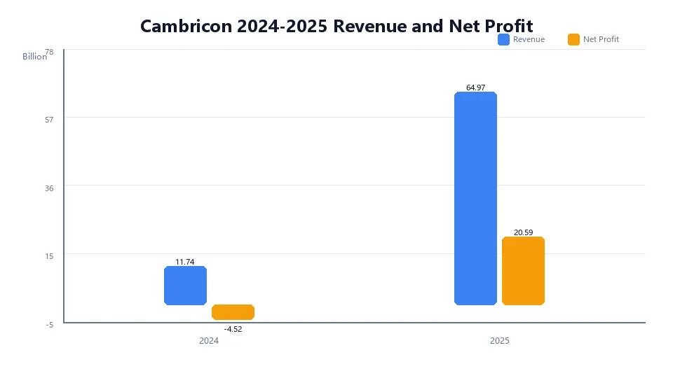 从数字上看,这份年报的确足够亮眼。公司2025年实现营业收入64.97亿元,同比增长453.21%;归属于上市公司股东的净利润20.59亿元,扣非后归母净利润17.70亿元,均实现了从亏损到盈利的切换。对于一家过去长期处于投入期、估值更多建立在产业想象和技术预期之上的AI芯片公司来说,这是一份很有分量的成绩单。