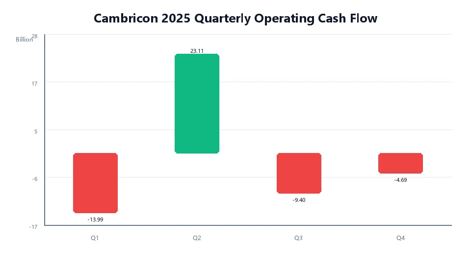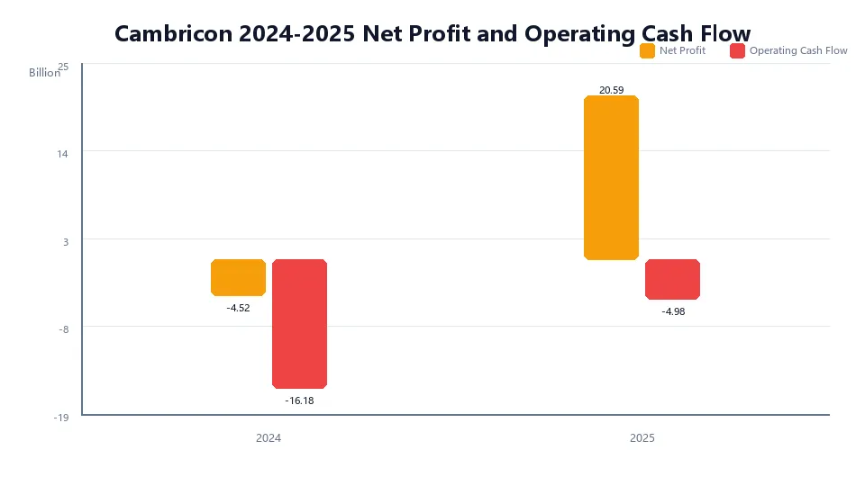 寒武纪2025年最值得反复推敲的,是经营活动现金流量净额仍然为负。公司当年归母净利润达到20.59亿元,但经营活动现金流净额为-4.98亿元。虽然较2024年的-16.18亿元已经显著改善,但未能转正这一事实本身,仍然具有较高的信息含量。