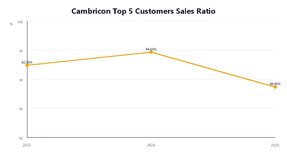 寒武纪2025年前五大客户销售额合计57.60亿元,占年度销售总额88.66%;其中第一大客户占比超过26%。过去三年,这一比例分别为92.36%、94.63%和88.66%,虽然较前两年略有下降,但整体仍然处于高度集中状态。