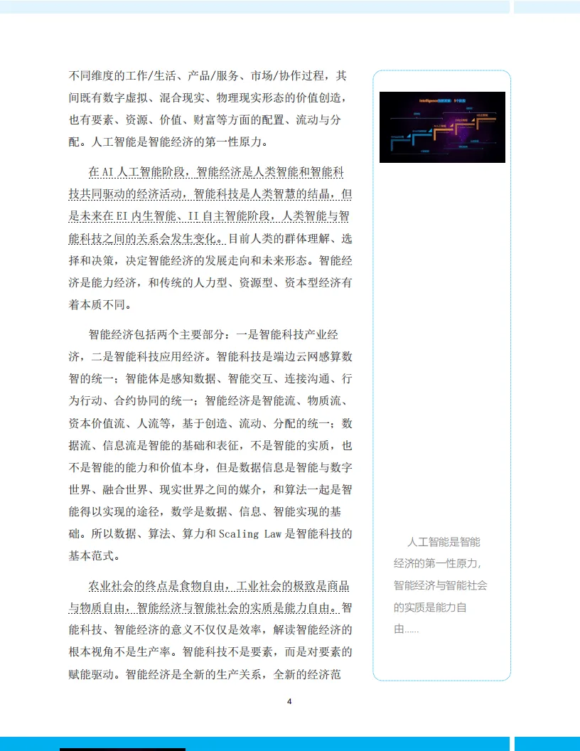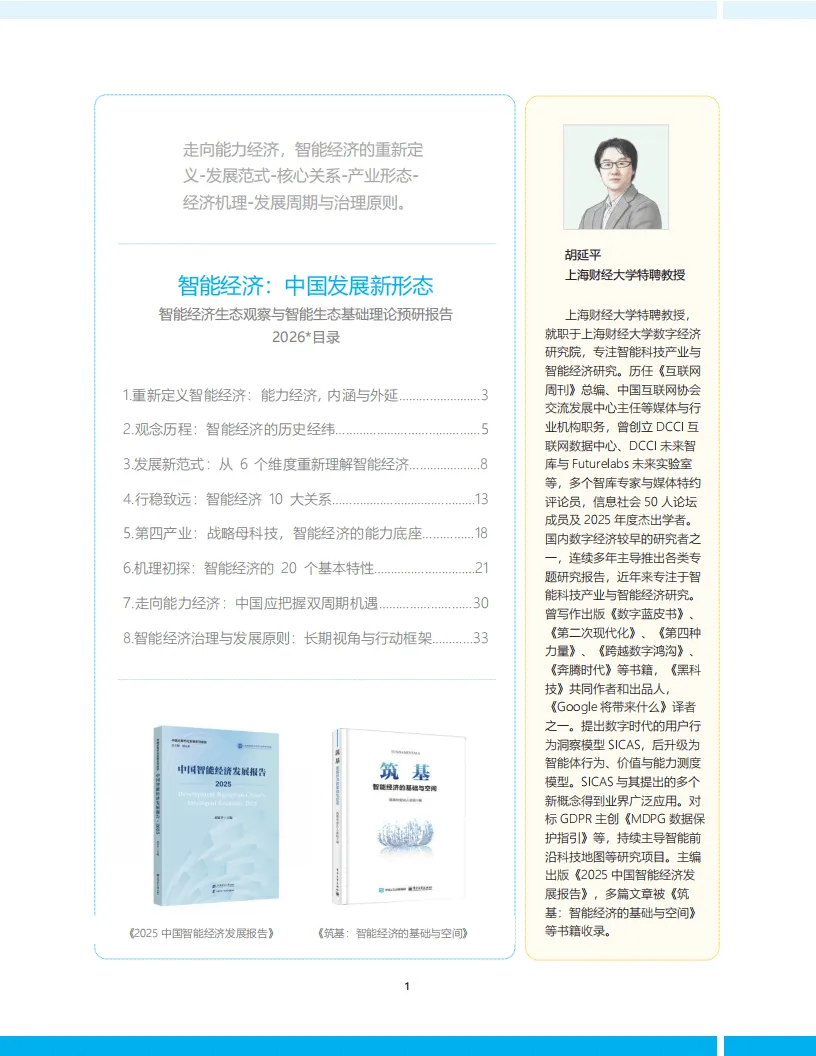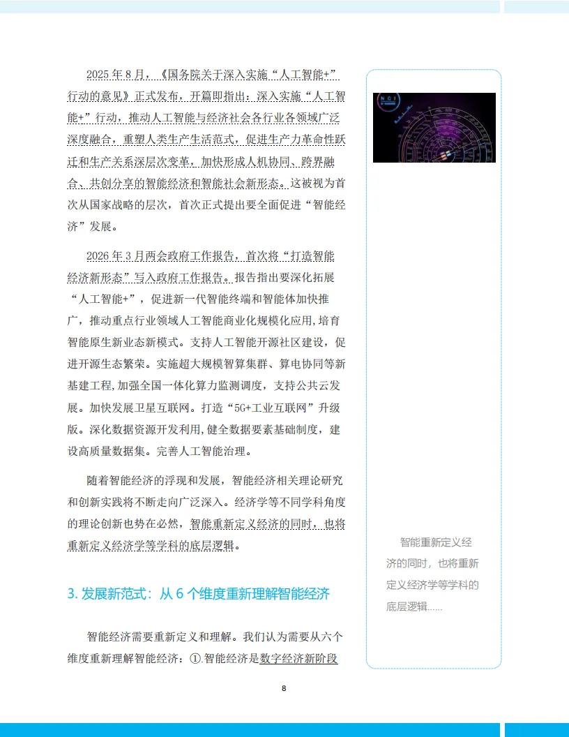 这份2026年智能经济生态观察与基础理论预研报告,核心将智能经济定义为以智能科技为原力驱动的能力经济,指出其是中国发展的全新形态,也是区别于人力、资源、资本型经济的全新经济范式,人工智能为其第一性原力,而智能经济与智能社会的核心是实现能力自由。报告梳理了智能经济的发展脉络,从早期相关概念提出到国家级政策持续深化,明确其已从数字经济新阶段,逐步成为国家发展的重要方向,其内涵远非效率提升,而是创造新能力、新需求与新经济形态,智能也成为支配传统资本的第五种资本。