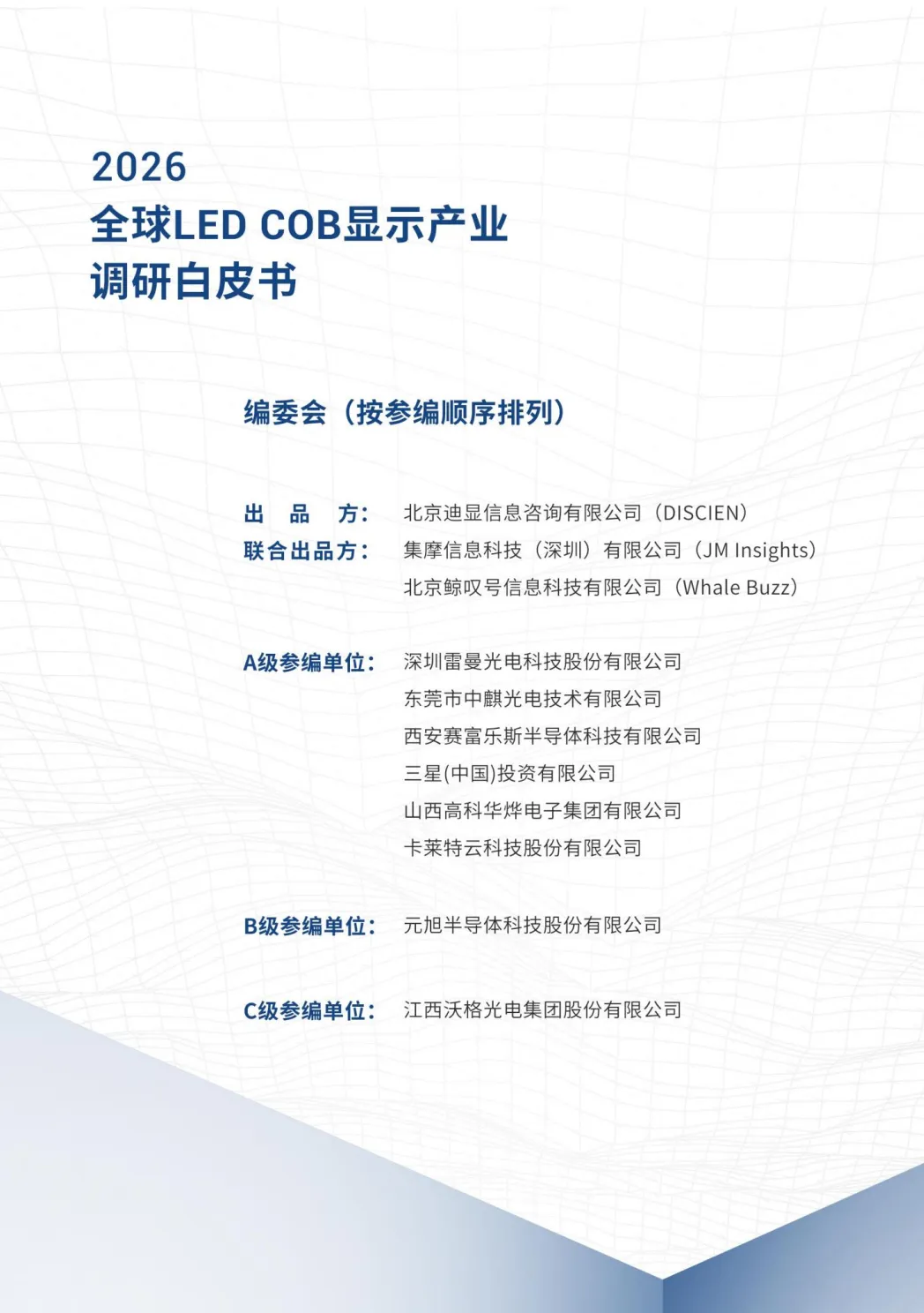 《2026全球LED COB显示产业调研白皮书》由DISCIEN(迪显咨询)联合多家机构及企业(如雷曼光电、中麒光电、三星等)共同编制,系统梳理了LED COB显示产业的发展现状、市场格局、技术演进、应用前景及未来趋势。以下是核心内容概括: