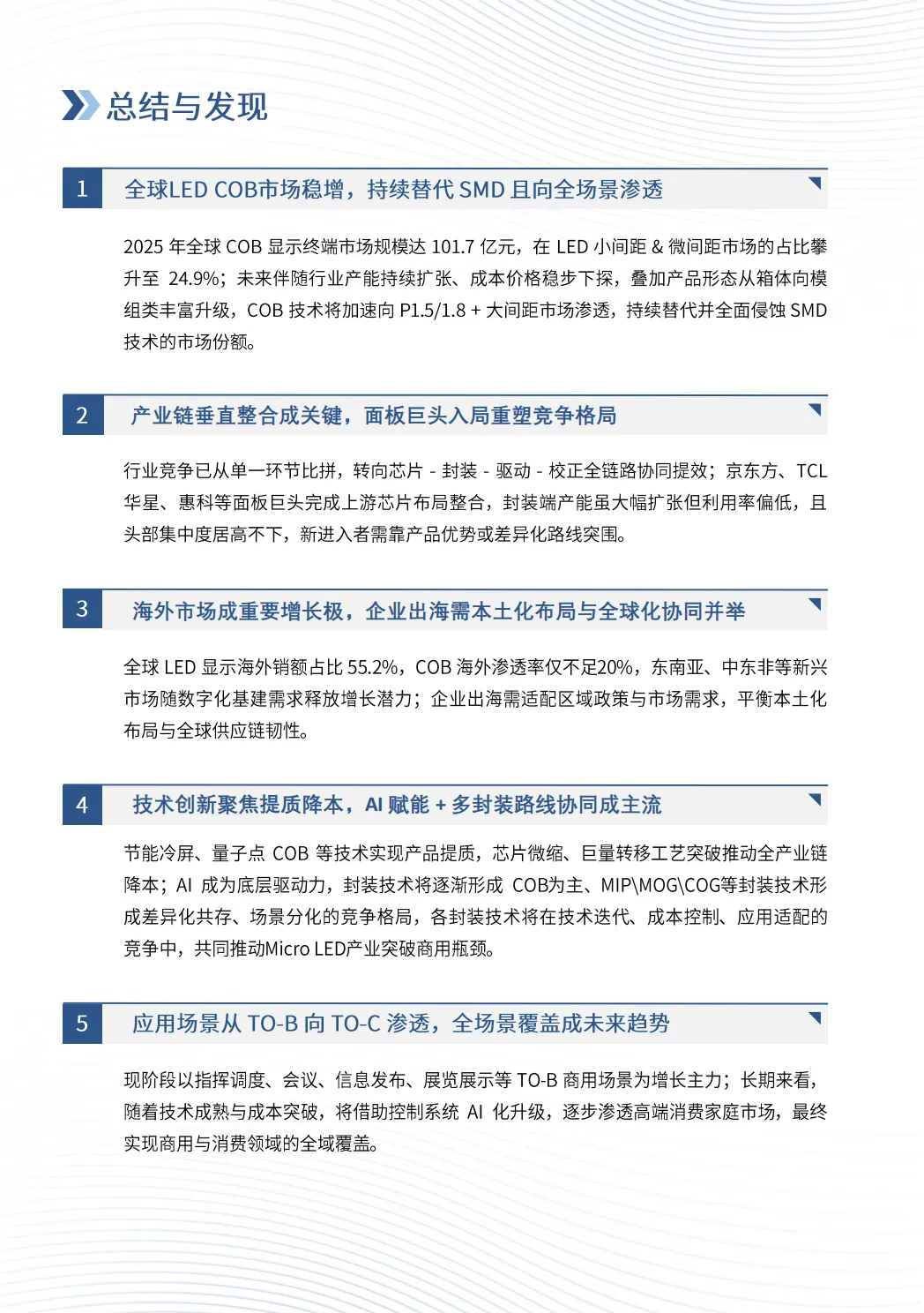 白皮书指出,LED COB显示产业正处在“技术迭代+场景深化”的高质量发展期,COB技术正加速替代SMD,并向全场景渗透。产业链垂直整合、海外市场拓展、AI与节能技术融合成为关键竞争方向。未来五年,COB将持续高增长,推动MicroLED从专业显示走向消费级应用。